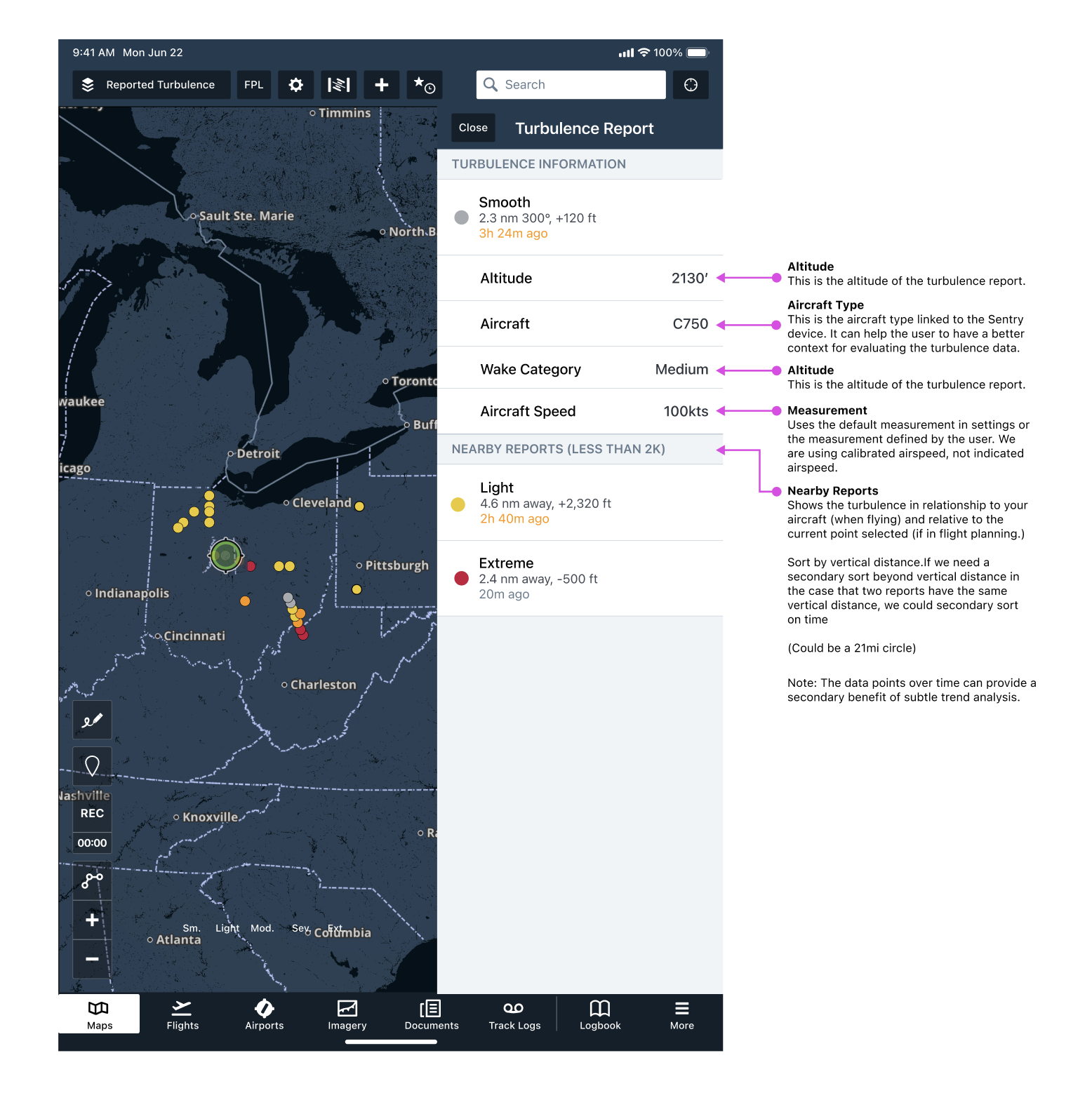 Turbulence reports are classified into intensity categories: Smooth, Light, Moderate, Severe, and Extreme. They’re then uploaded to ForeFlight Mobile as soon as an internet connection is established after or even during a flight.