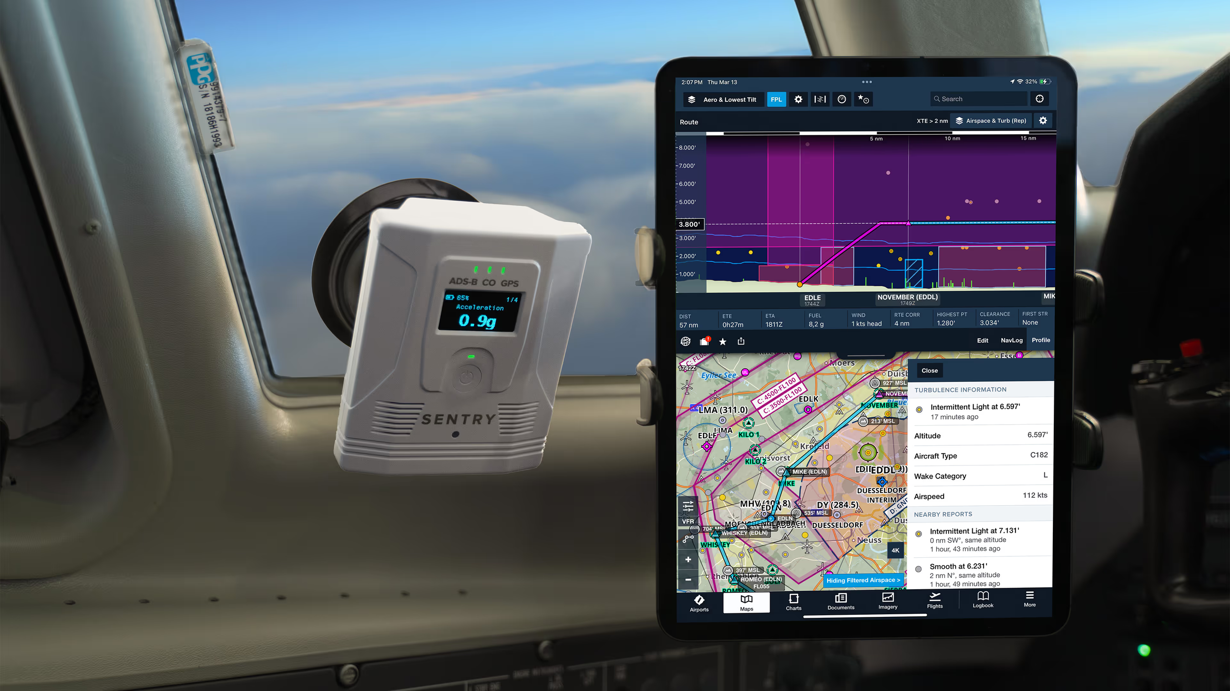The ForeFlight Sentry and SentryPlus receivers are equipped with several sensors that measure turbulence in addition to their other functions, using a unique algorithm developed in-house. The sensors detect, classify, and automatically save ride-quality reports, circumventing the subjective nature of manually submitting PIREPs. Reports are saved every two minutes, giving a high degree of accuracy.