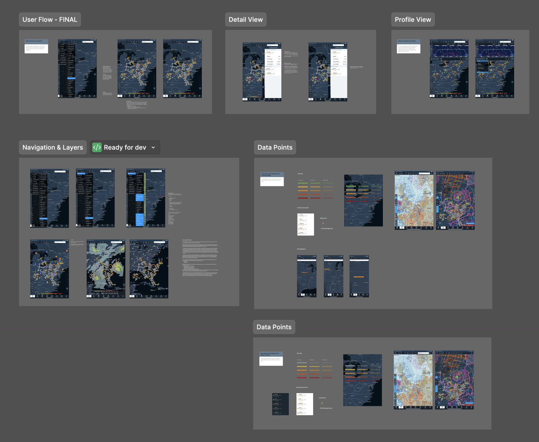 The display of the turbulence data had many iterations. I was trying to find a good representation that could be viewed on multiple map layers, and across both top view and profile view.