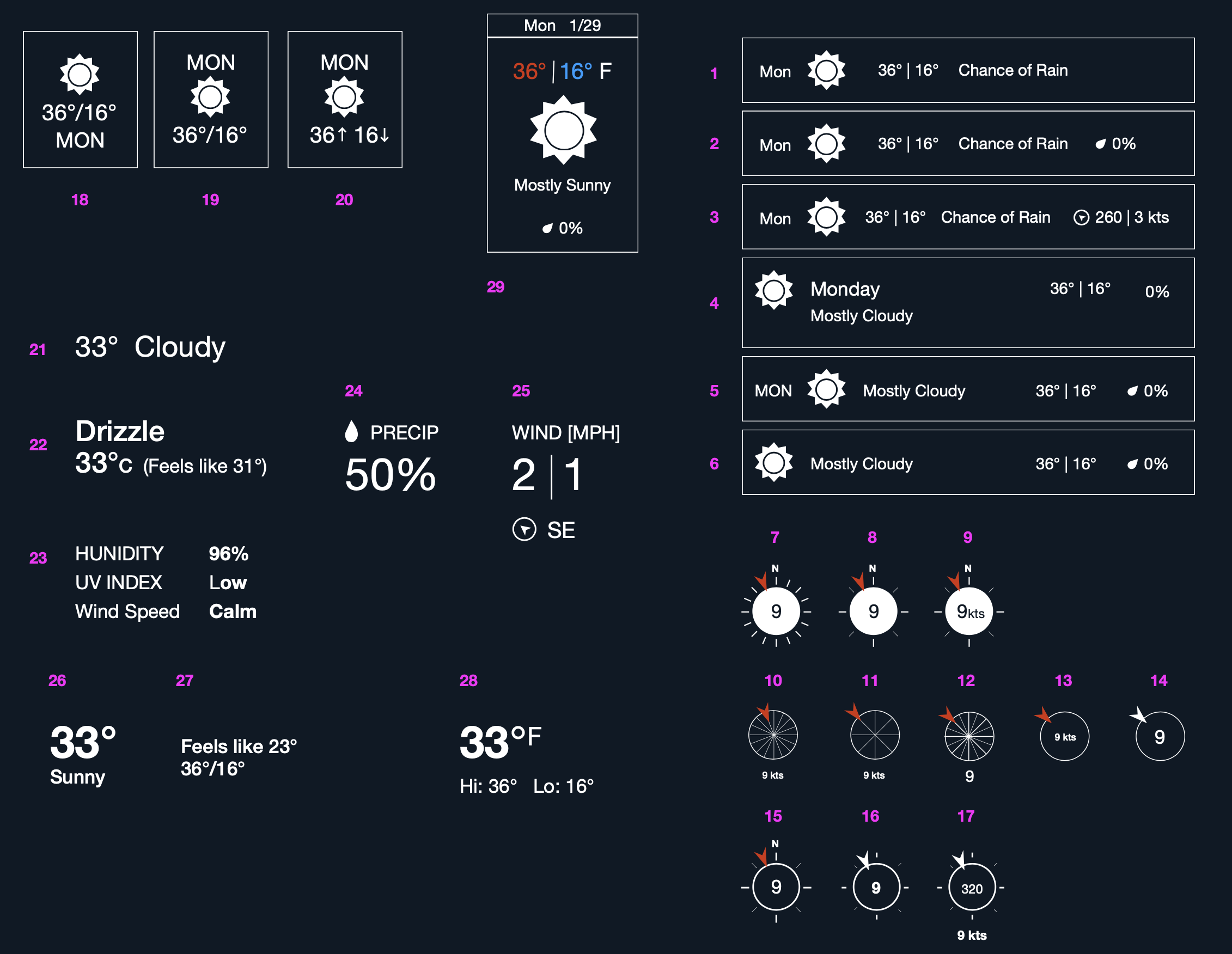 This feature had several components: the UX/UI of the interface itself, the iconography for the weather forecast types and the additional components of wind speed, precipitation and visibility- all of which are essential for pilots to know when planning a flight.