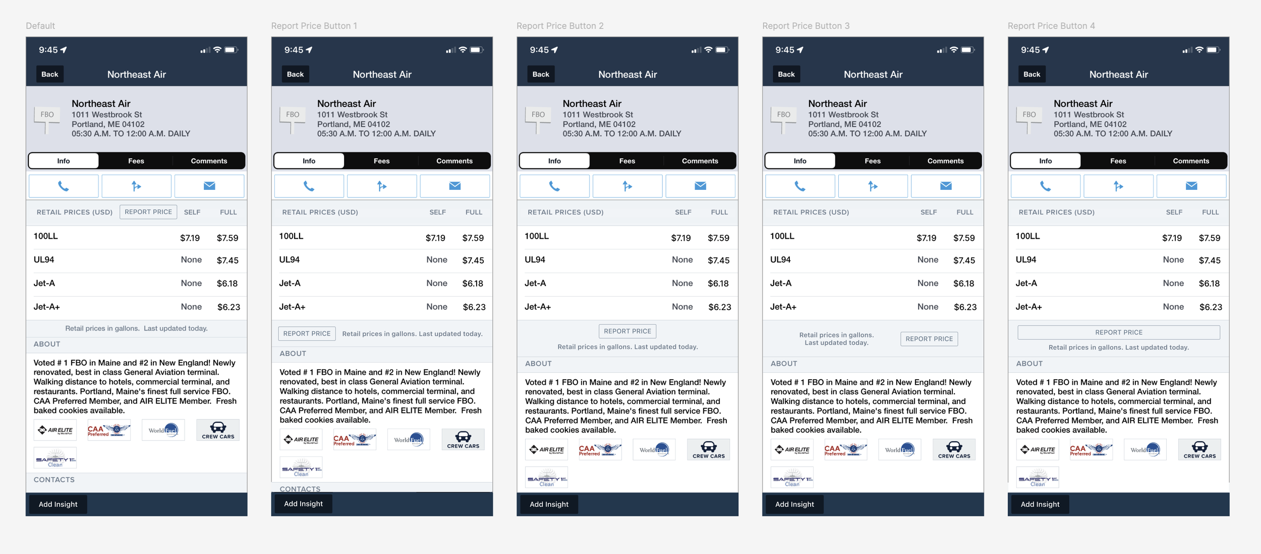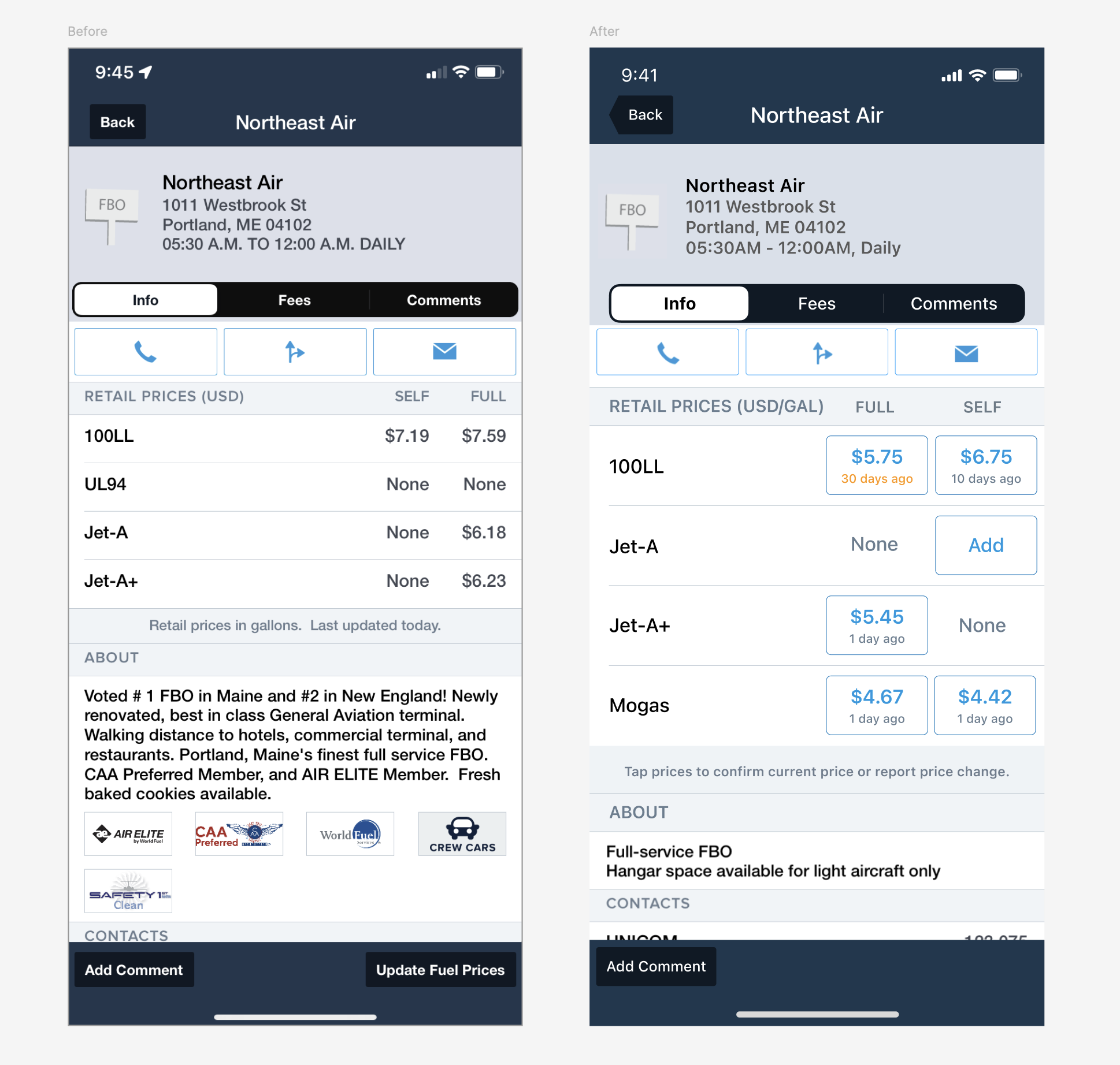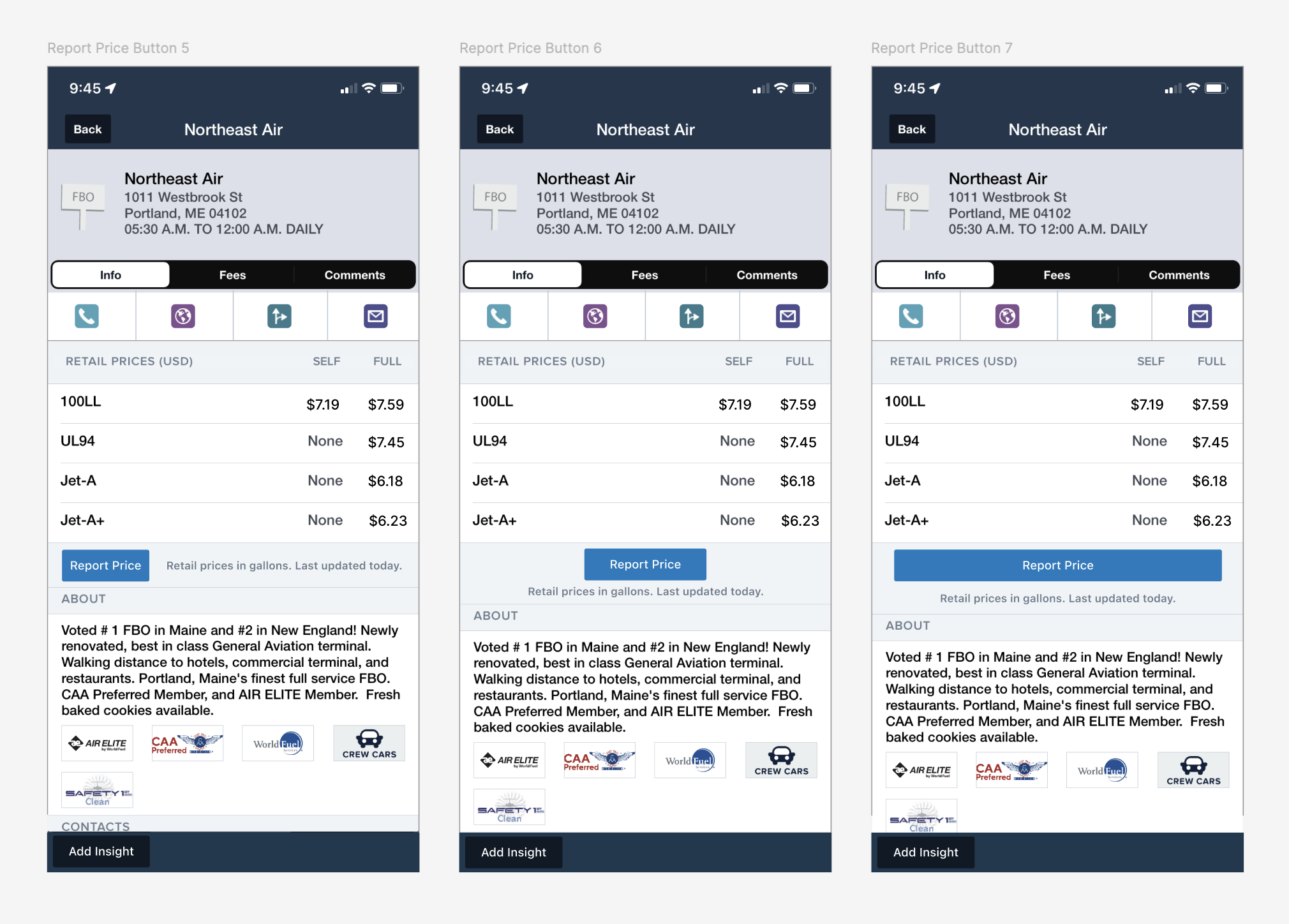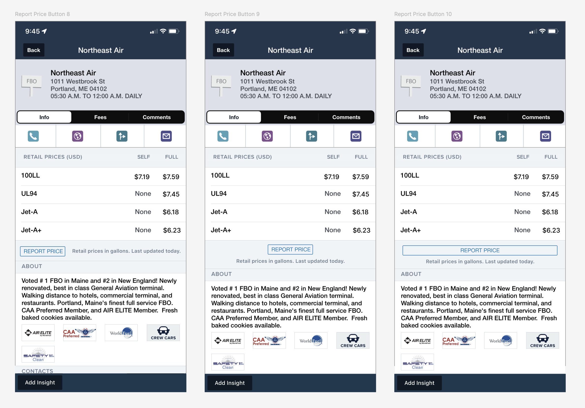 Despite this capability, the FBOs were having an issue with inaccurate or outdated information for their fuel. ForeFlight wanted to maintain their trusted relationship with customers by providing the most up to date information, despite the FBOs not always keeping their information up to date. The placement of the fuel button was an obvious first step but there was more to uncover.