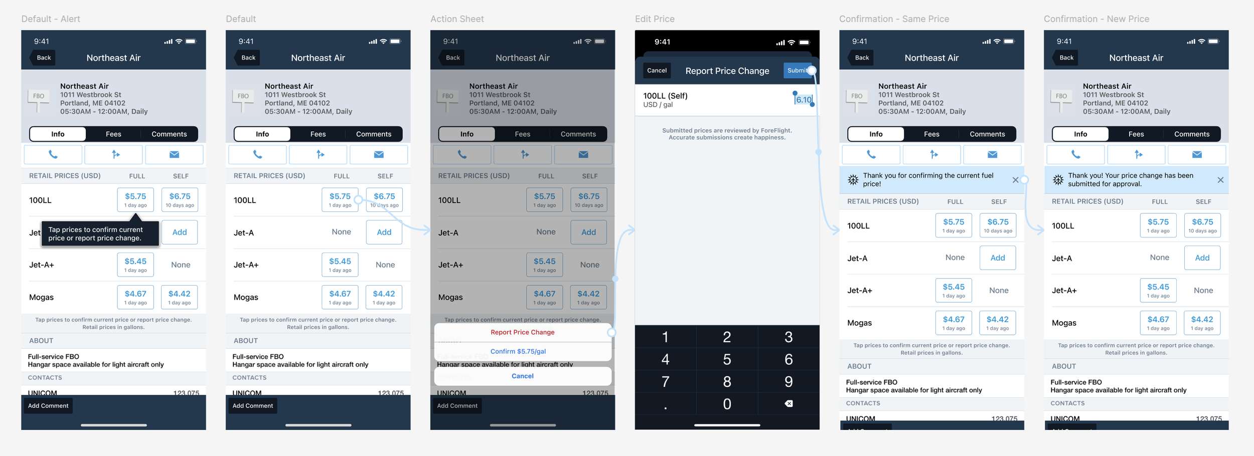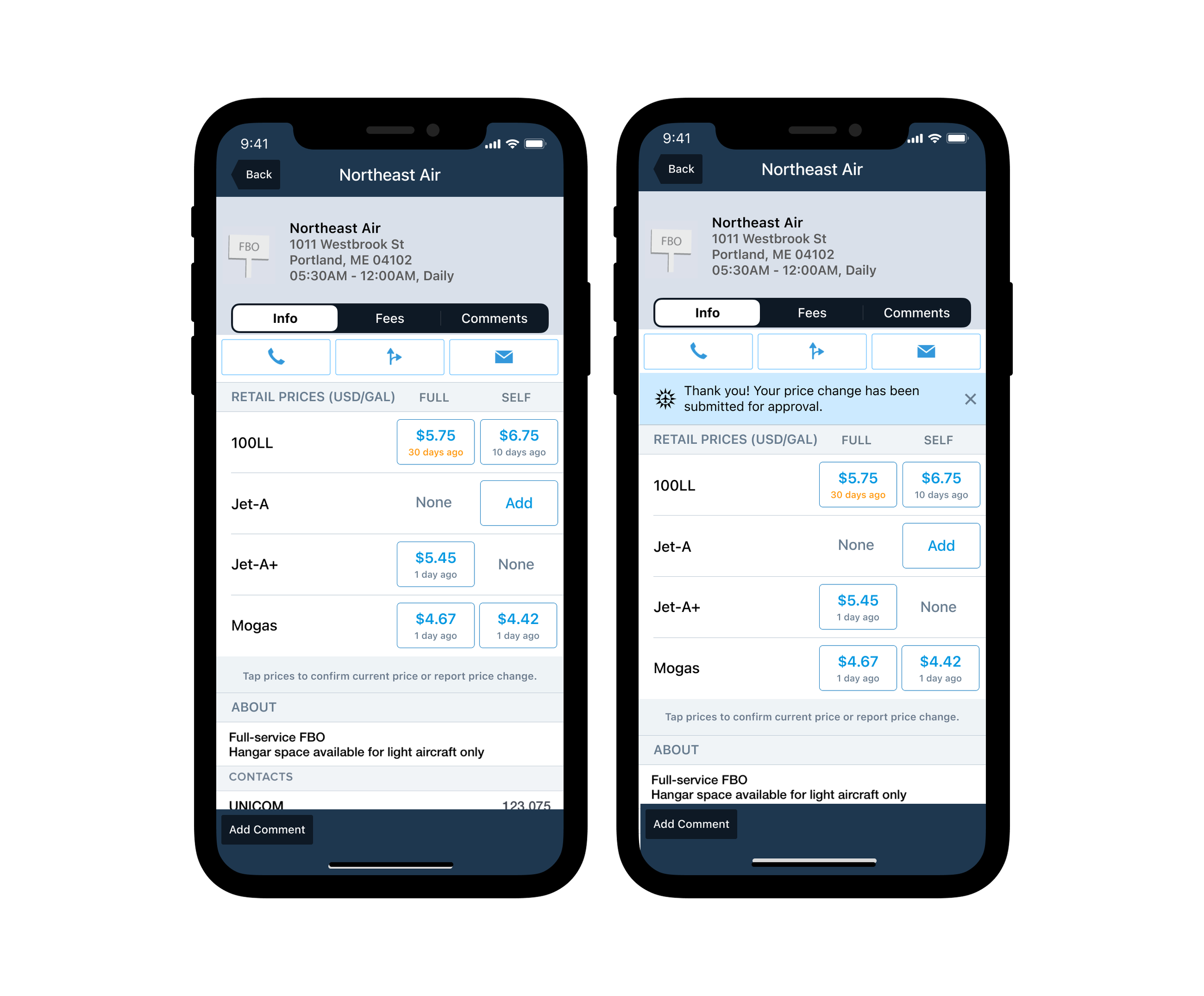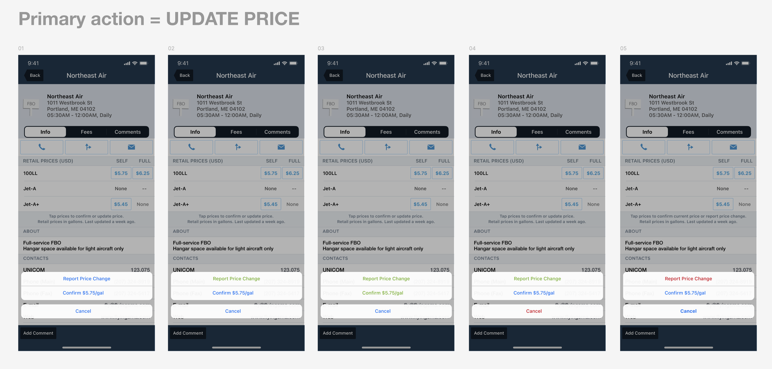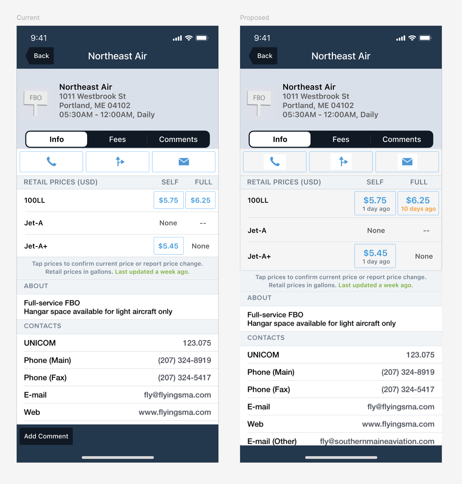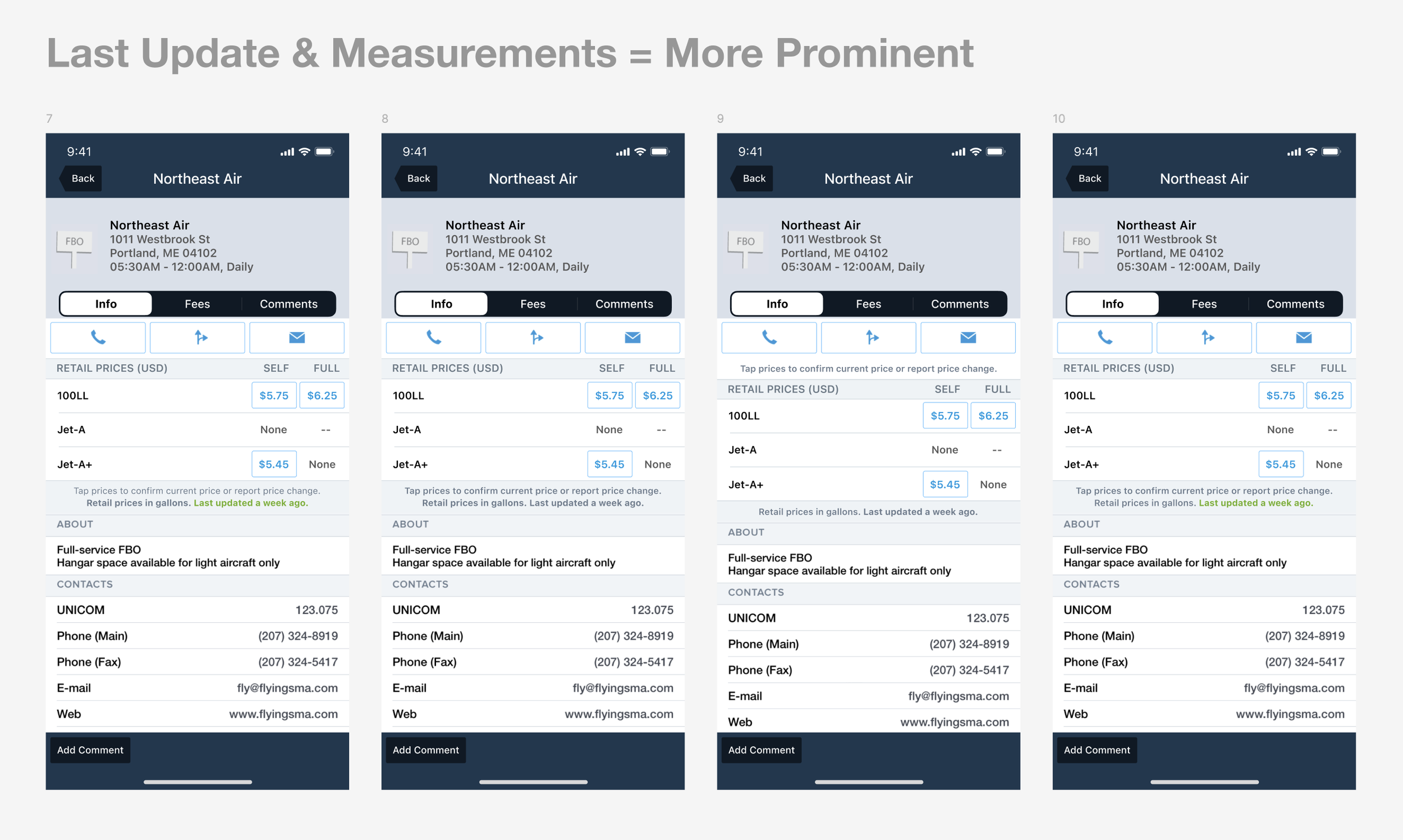 Despite this capability, the FBOs were having an issue with inaccurate or outdated information for their fuel. ForeFlight wanted to maintain their trusted relationship with customers by providing the most up to date information, despite the FBOs not always keeping their information up to date. The placement of the fuel button was an obvious first step but there was more to uncover.