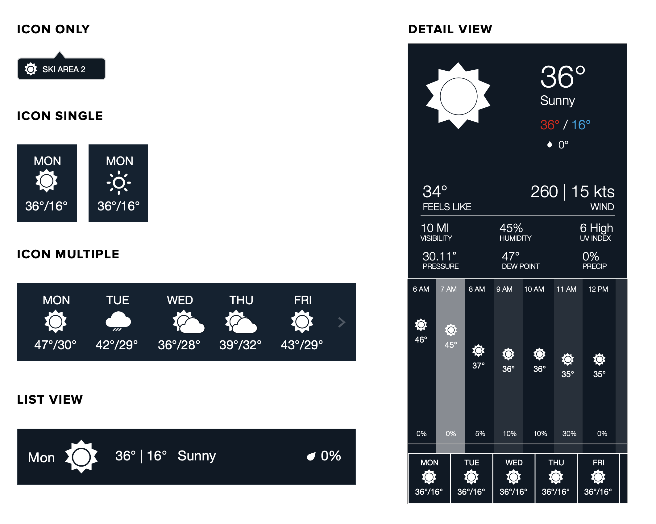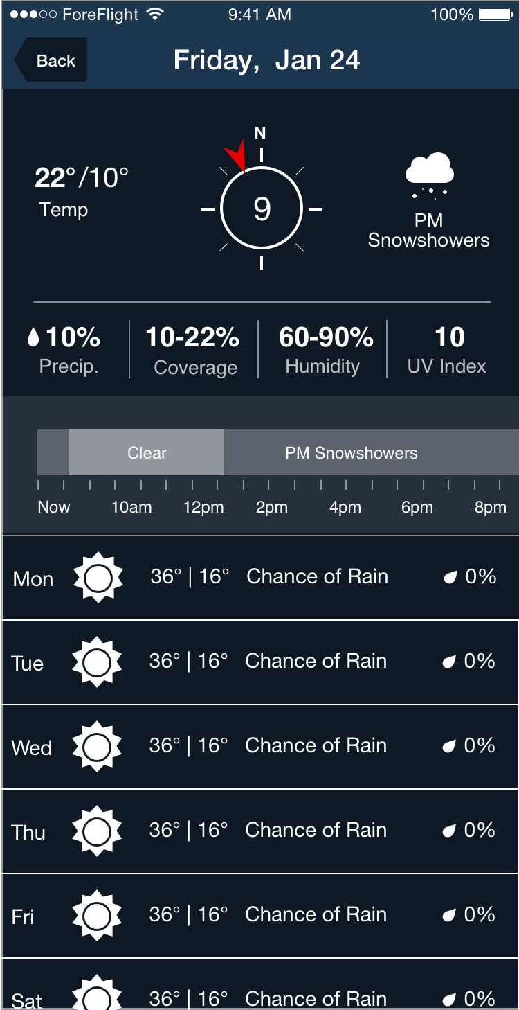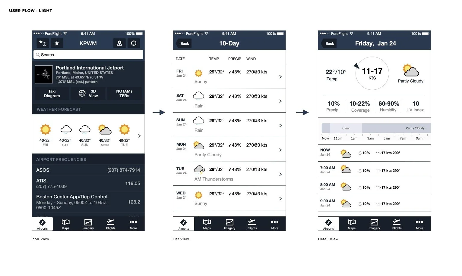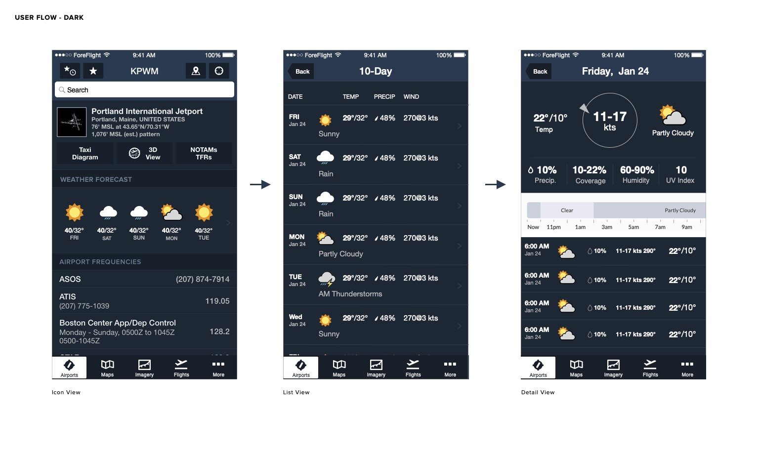 This feature had several components: the UX/UI of the interface itself, the iconography (for both light and dark modes) for the weather forecast types and the additional components of wind speed, precipitation and visibility- all of which are essential for pilots to know when planning a flight.