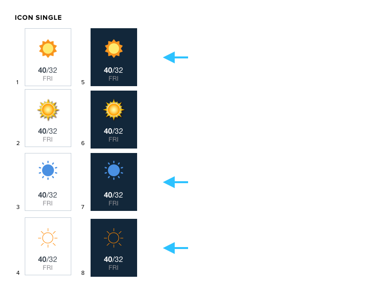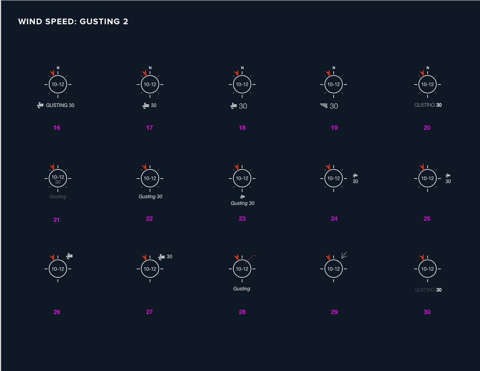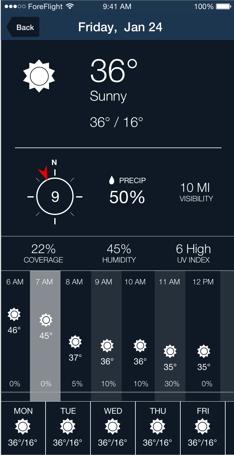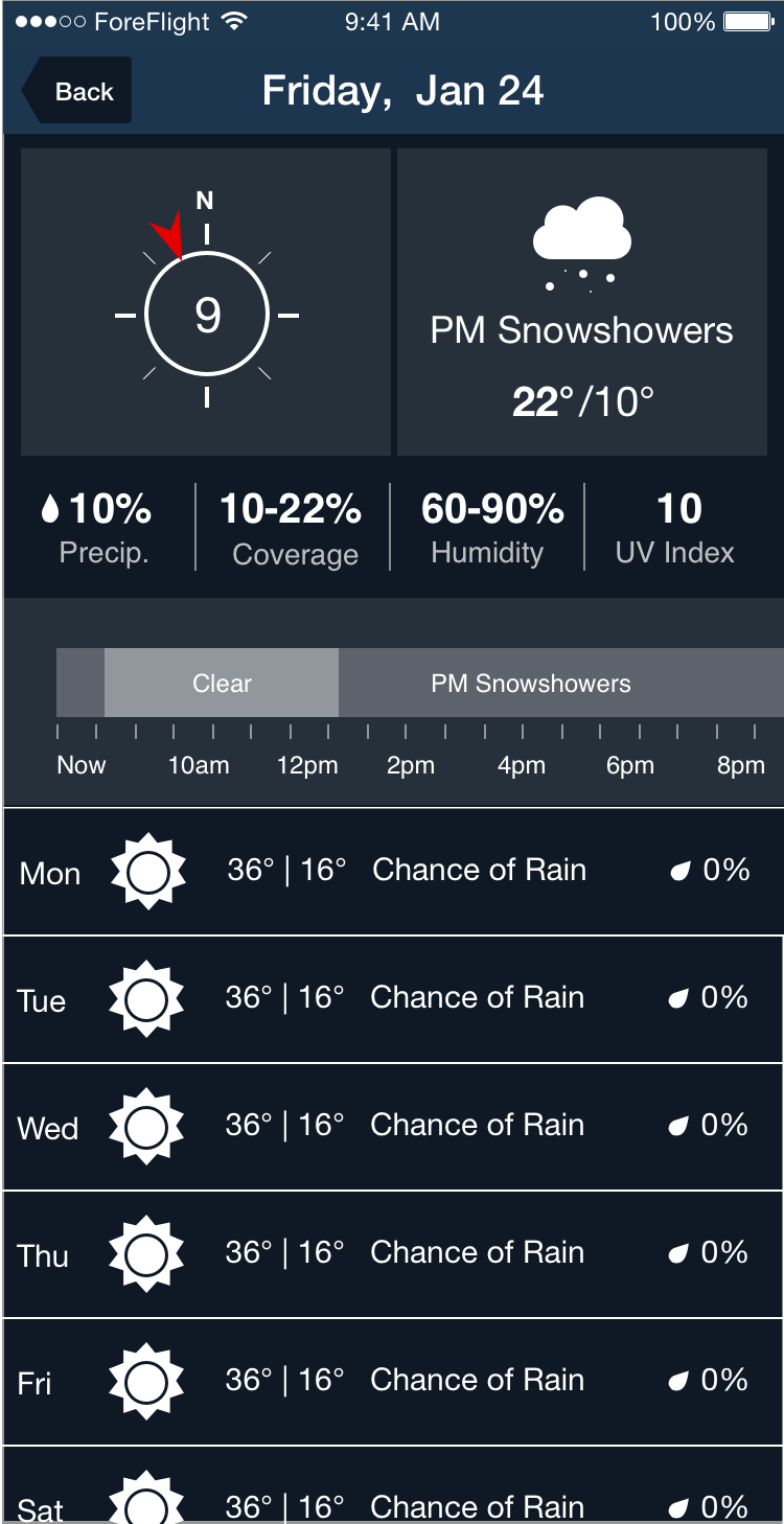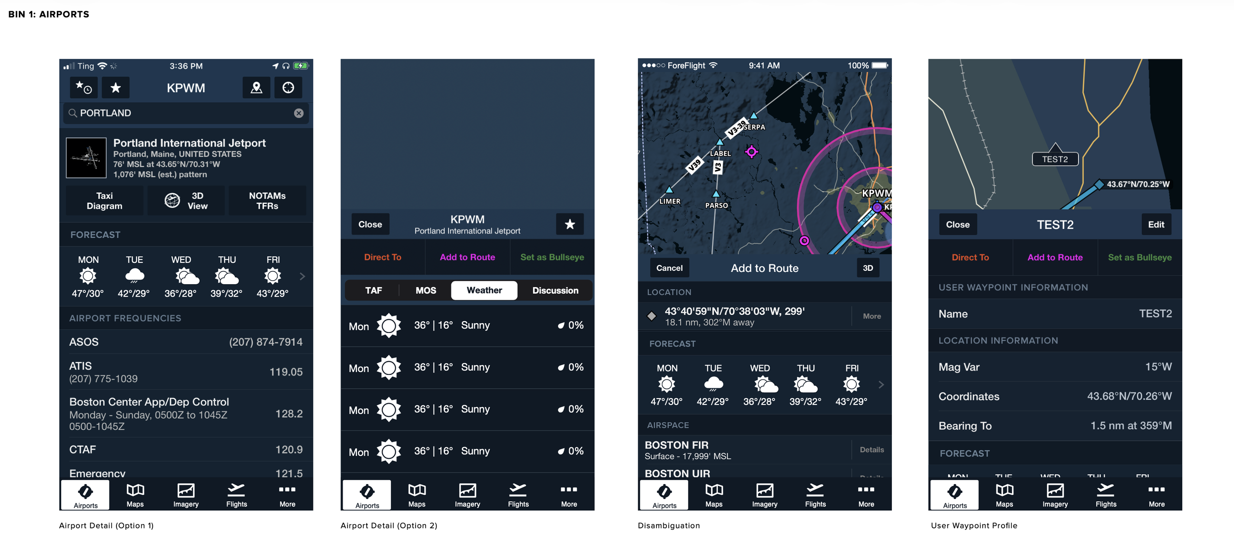 This feature had several components: the UX/UI of the interface itself, the iconography (for both light and dark modes) for the weather forecast types and the additional components of wind speed, precipitation and visibility- all of which are essential for pilots to know when planning a flight.